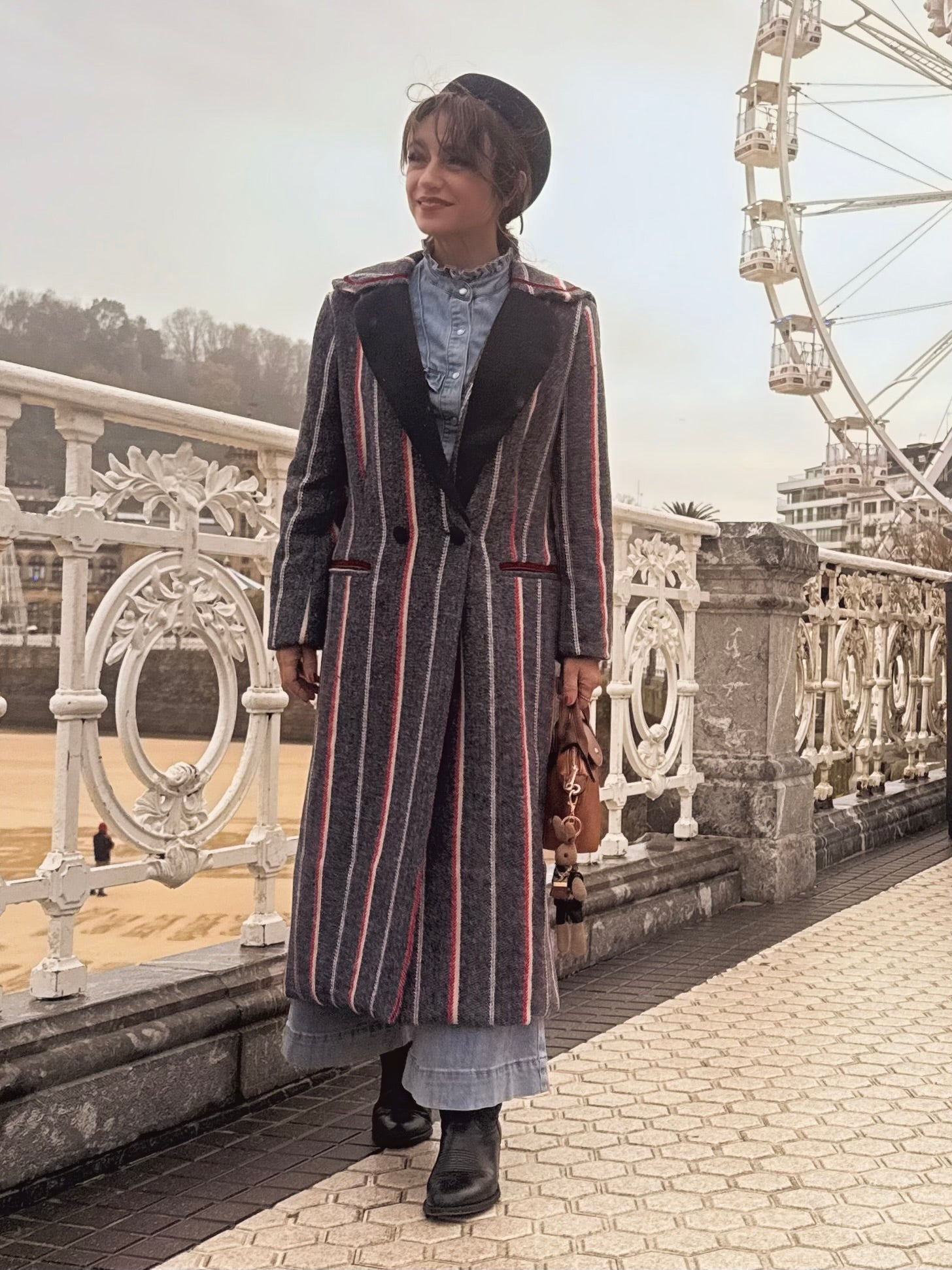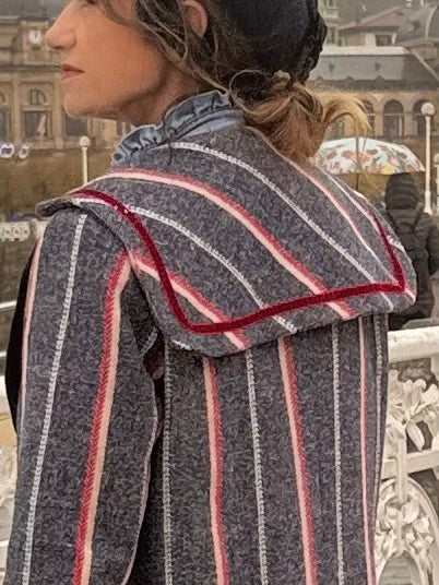 El corte clásico le da ese aire atemporal que siempre funciona, y los detalles lo hacen especial: rayas verticales que estilizan, cuello marinero, solapas de paño y cintas de raso que aportan un acabado cuidado y diferente.