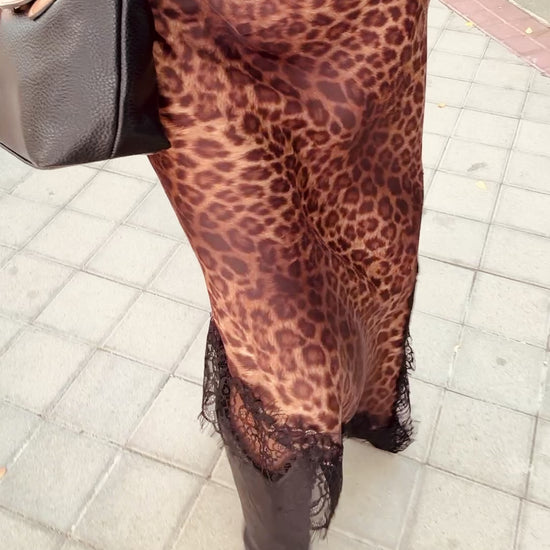 Su tejido satinado de leopardo capta la luz y el movimiento de forma espectacular, mientras la puntilla en el bajo y la abertura lateral añaden un toque femenino y magnético.