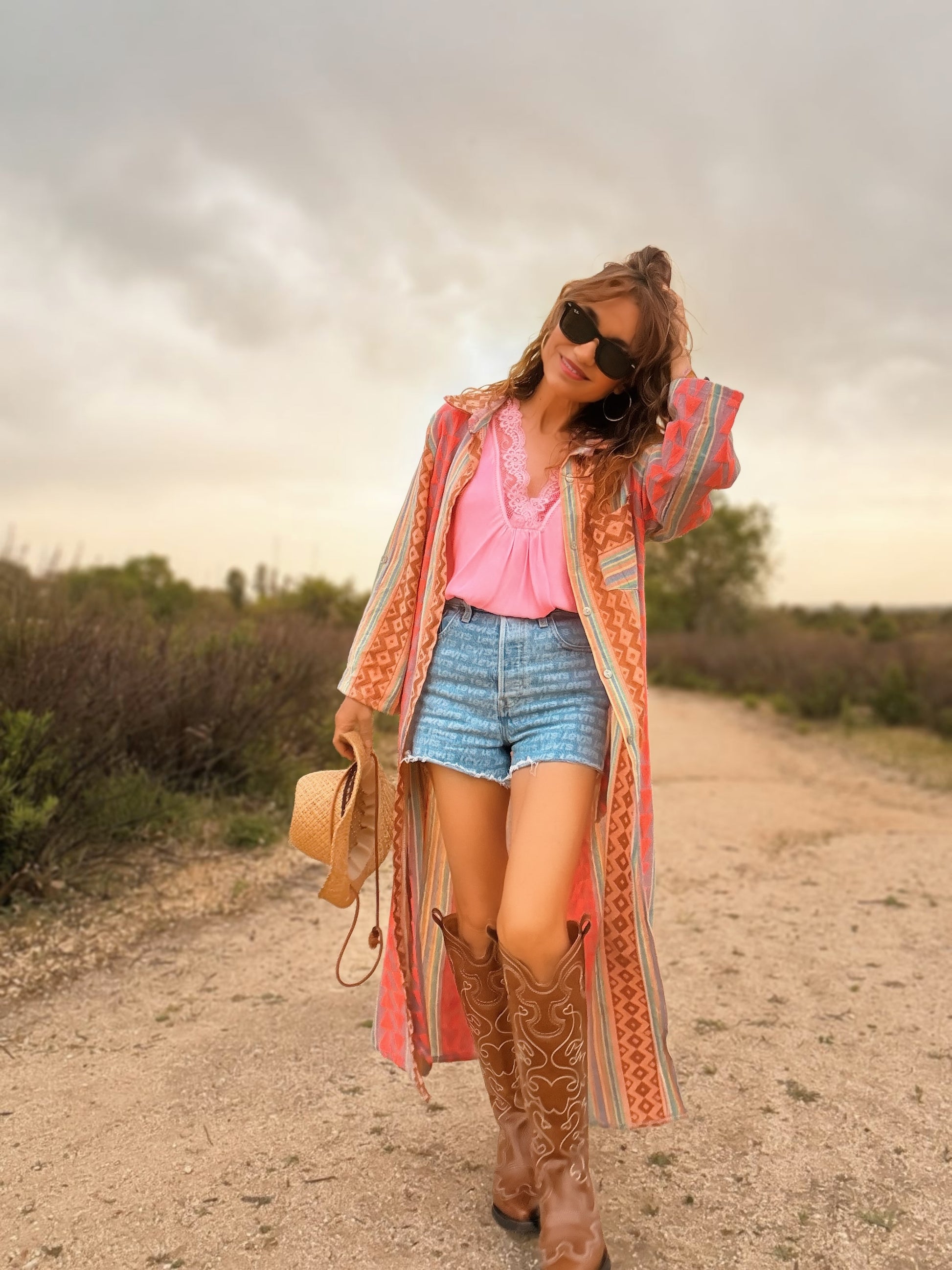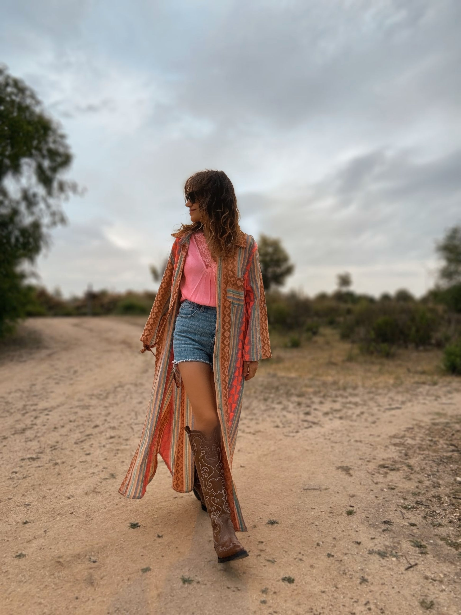 Lo combino perfecto con unas palas en marrón cuero, pero le doy un aire distinto al atardecer. Lo llevo como guardapolvo con un short, un top, botas cowboy y sombrero.